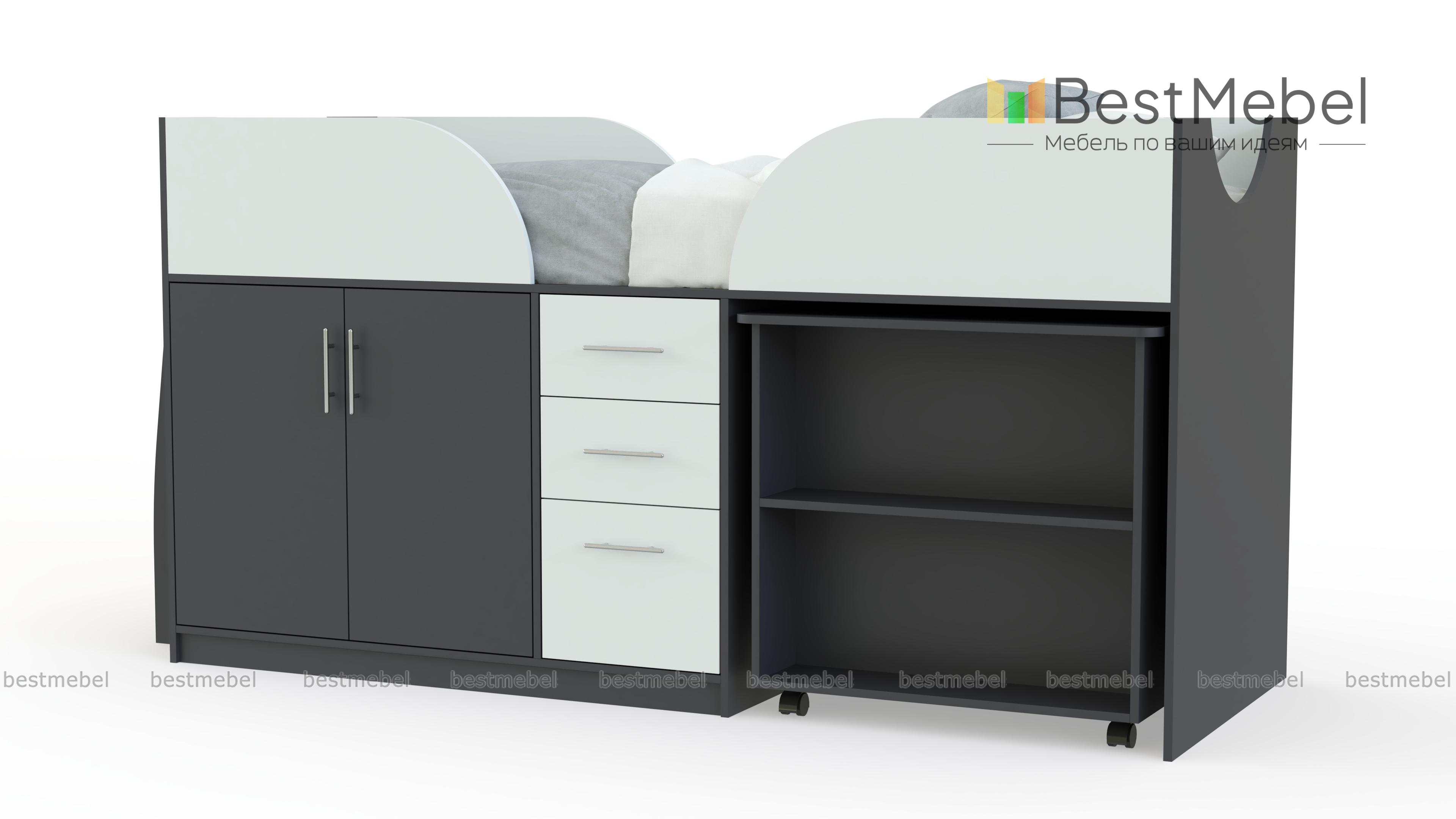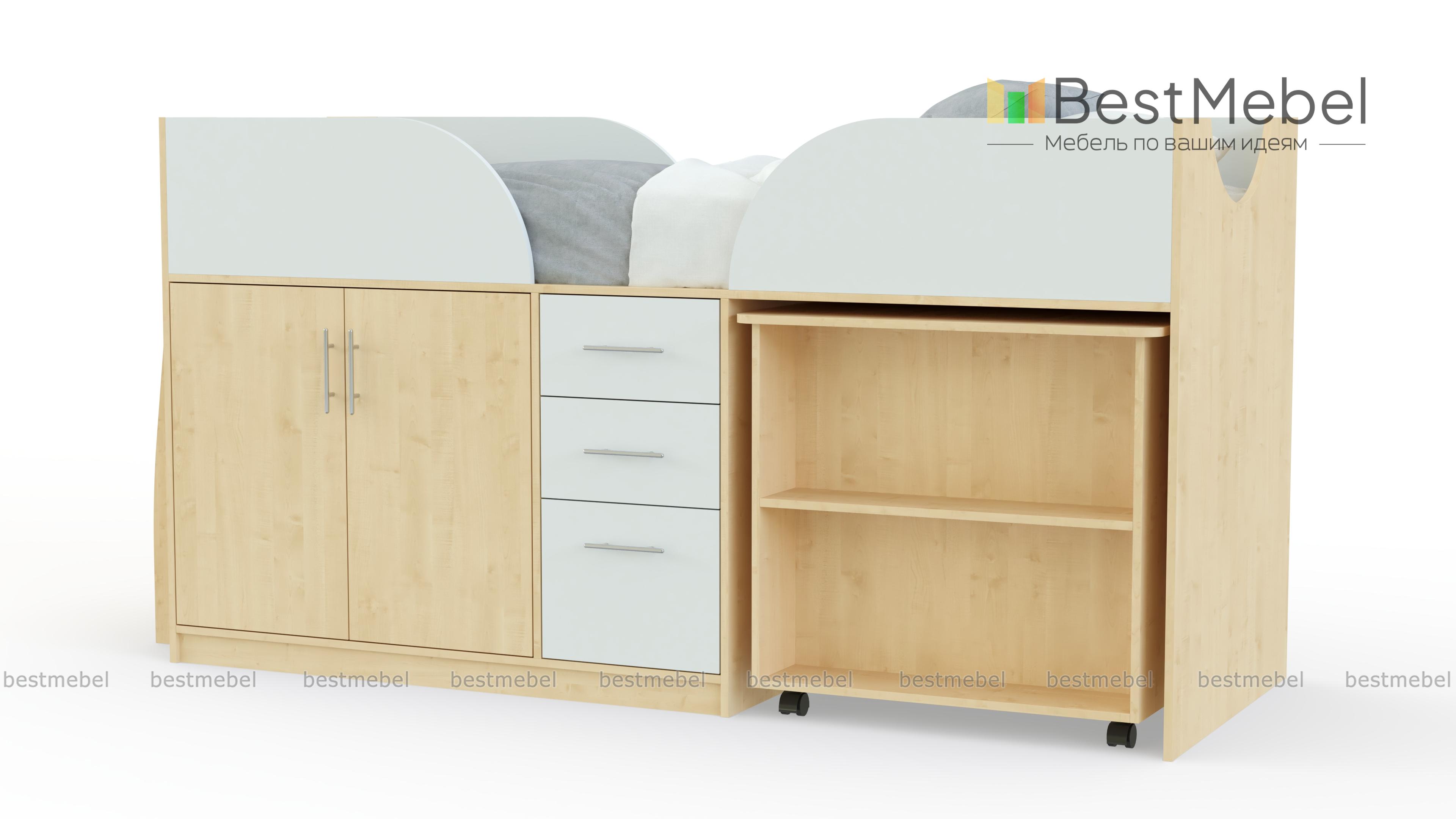 Детская кровать-чердак Дет41 BMS – оптимальное приобретение, если нужно получить практичную модель. Она сэкономит место в маленькой спальне. Постель расположена наверху, оснащена бортами. Попасть в нее можно по лестнице с хромированными ступенями-трубами. Нижняя часть представляет систему хранения: шкаф с двумя дверцами (внутри полка), комод с 3-мя ящиками выдвижного типа. Учиться или заниматься творчеством ребенок сможет за столом, лицевая часть оснащена полками. Отличная возможность аккуратно расставить книги, учебники! Элемент выдвигается из-под основания кровати. Цветовая гамма ЛДСП представлена в вариантах, подходящих для мальчика или девочки.