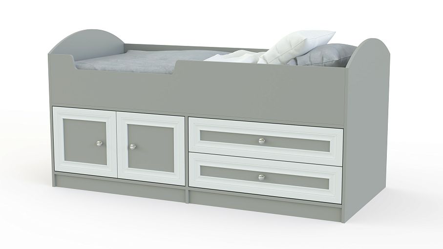 Симпатичная детская кровать Твинс-3 BMS решает проблему с организацией места для сна ребенку-дошкольнику. В конструкции соединяются постель (габариты 60 х 170 см) с ДСП-основанием и элементы для хранения одежды, игрушек, текстиля. Они представлены в виде двух выдвижных ящиков и объемной ниши с распашными дверцами. Привлекательное рамочное оформление фасадов создает респектабельный запоминающийся облик, лаконичный стиль. В цветовой гамме ЛДСП каркаса сочетаются два оттенка.