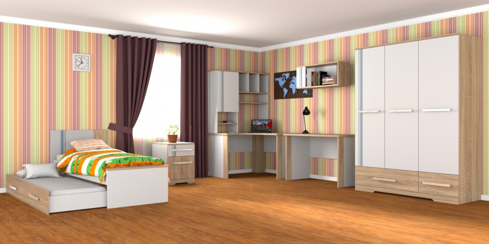Комплект Детской мебели Лион К3 BMS поможет полностью оборудовать комфортную для учебы и отдыха комнату для двух подростков. В комплект входят кровать с выдвижным дополнительным спальным местом, два письменных стола – прямой и угловой, тумба для оргтехники и канцелярских принадлежностей, навесная полка и вместительная надстройка. Для хранения одежды предусмотрен трехдверный распашной шкаф с ящиками в основании. Выполненная в светлых тонах с вертикальными цветными вставками, модель сделает комнату визуально просторнее. Купить комплект детской мебели Лион К3 BMS приглашаем в наш интернет-магазин по лучшей цене.
