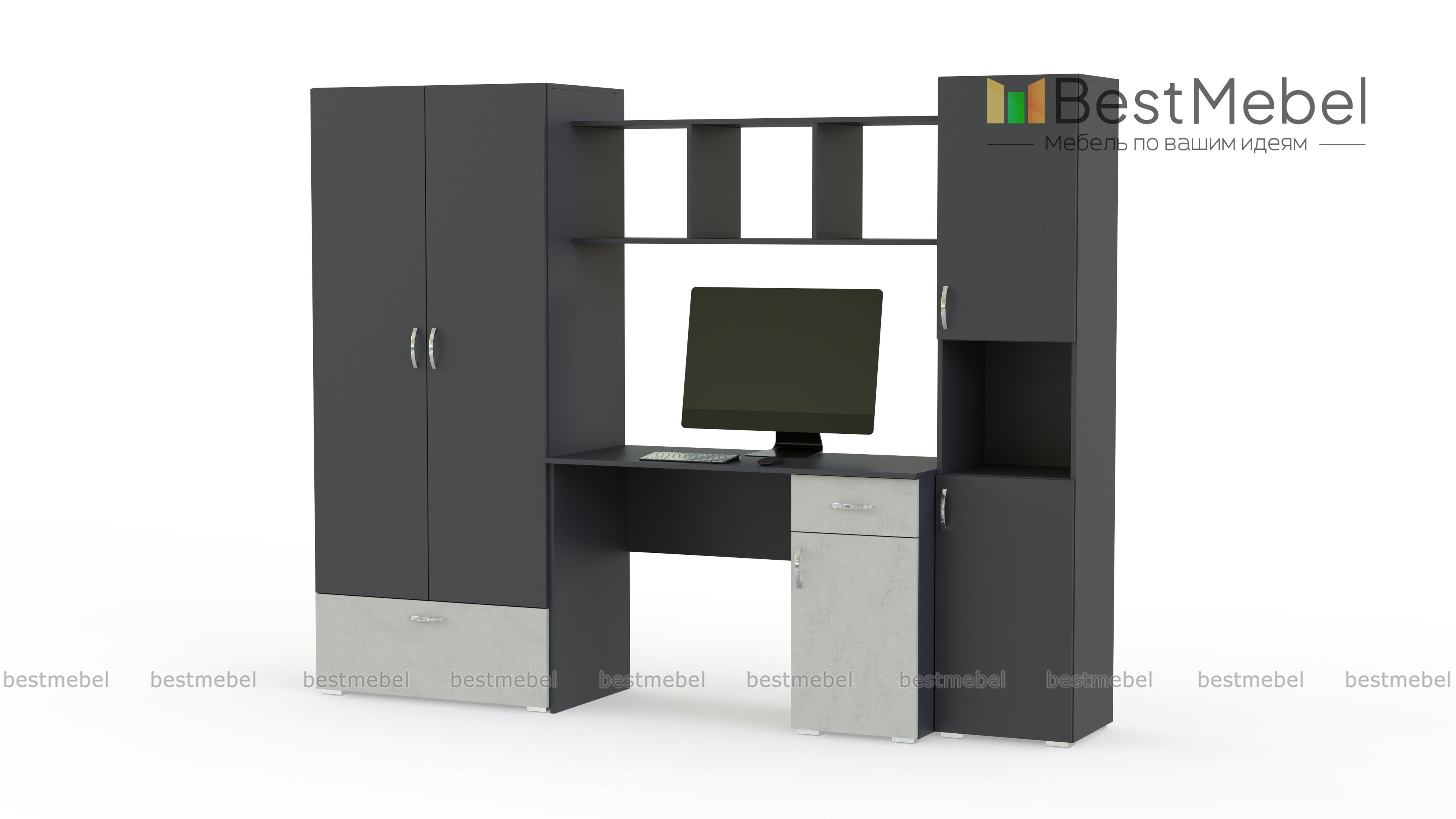 Легкий и изящный комплект, выполненный в нежных тонах и декорированный по фасадам шелковистым материалом, подойдет комнате юной леди. Простой и лаконичный по форме, он включает все необходимые для учебы, хранения гардероба, школьных принадлежностей и игрушек элементы. Элегантный письменный стол с тумбой, двухдверный одежный шкаф, открытые полки и вместительный пенал детской стенки Ариэль BMS вместе составляют гармоничную комбинацию и станут стильным акцентом современного дома.