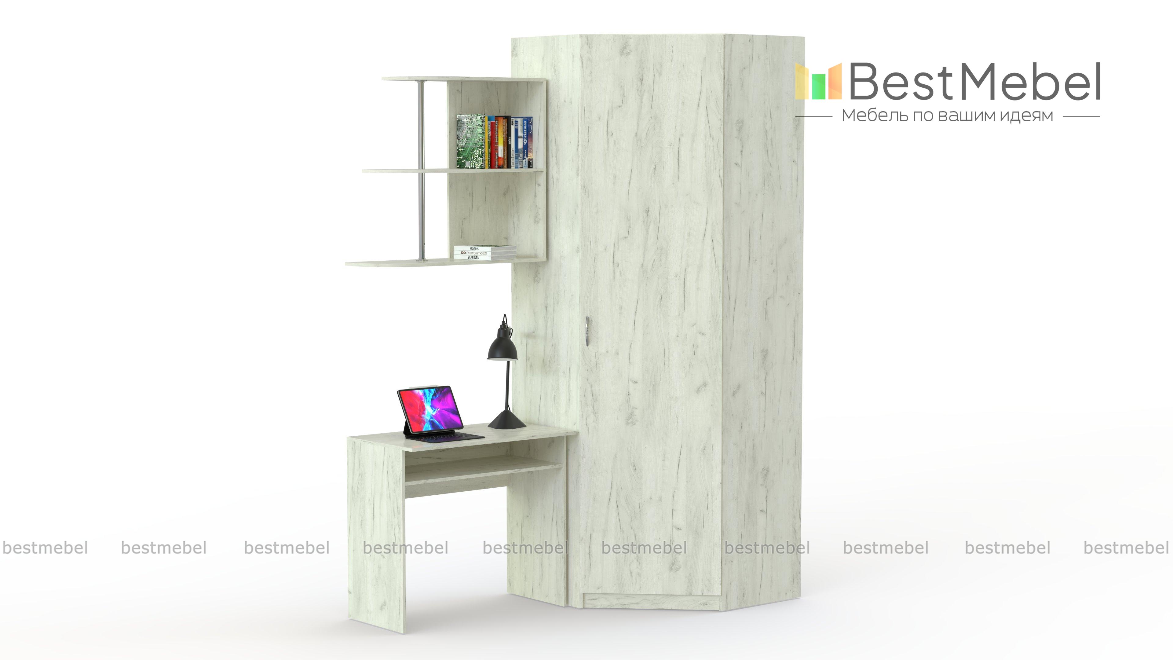 Угловой шкаф Коломбо BMS дополнен письменным столом и открытой полкой, помогая не только разместить предметы гардероба, но и обустроить комфортную рабочую зону. Мини-комплект отличается строгим классическим дизайном и гармонично впишется в интерьер небольшой молодежной комнаты, спальни или гостиной. Благодаря трапециевидной форме шкаф компактен, но при этом отличается просторным внутренним отделением. Купить угловой шкаф Коломбо BMS вы сможете в нашем интернет-магазине, подобрав оптимальные параметры.