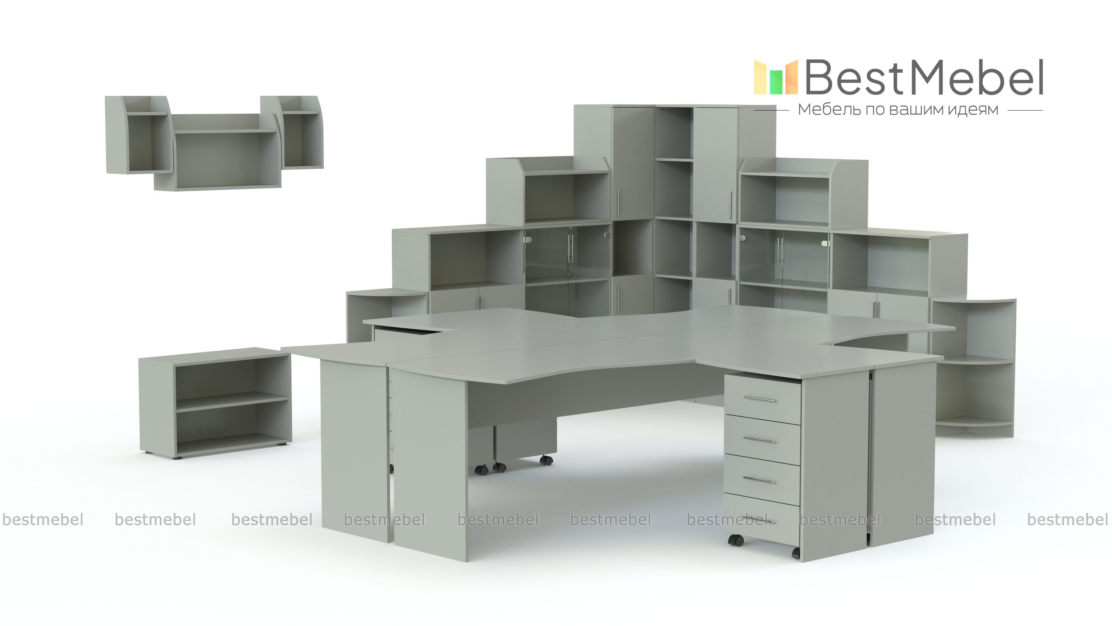 Офисный комплект Премьера 2 подойдет для организации рабочего пространства для персонала в солидной и успешной фирме. 4 больших стола могут размещаться по кругу, для сплочения коллектива и эффективной работы или отдельно, для обеспечение личного пространства каждому.