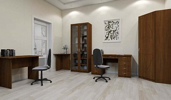 Офисный комплект Учитель-3 BMS поможет оборудовать пространство офиса с максимальным комфортом. В комплект входят три стола – маленький угловой и два прямых письменных, застекленный книжный шкаф и однодверный угловой со штангой для одежды. Все модули выполнены в классическом стиле, фасады насыщенных оттенков под массив дерева дополнены простыми и изящными ручками-скобами, одежный шкаф декорирован фрезеровкой. Купить офисный комплект Учитель-3 BMS недорого приглашаем в наш интернет-магазин.