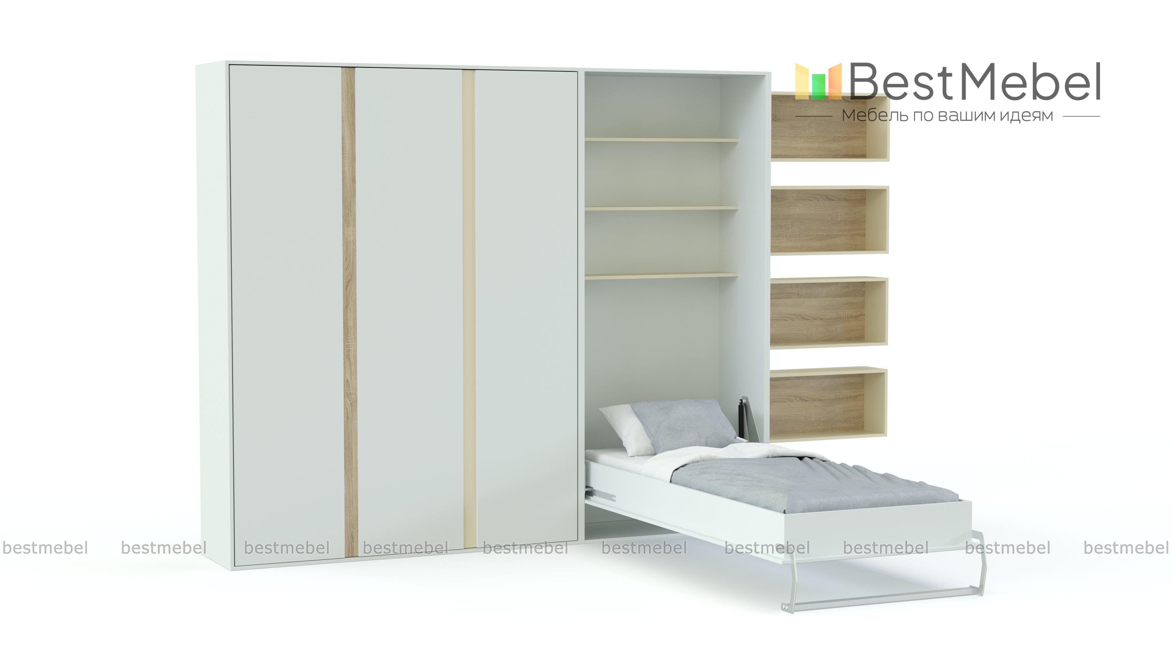 Шкаф-кровать трансформер Фиона 34 BMS – стильная альтернатива привычной мебели в интерьере современной молодежной комнаты. Креативный дизайн сочетается с высокой функциональностью в универсальной композиции 2 в 1. Вместительный шкаф для белья и одежды дополнен модулем-трансформером с откидной кроватью и оригинальными навесными полками для книг и декоративных мелочей. Спальное место раскладывается при помощи вертикального механизма, внутри ниши находятся открытые полки. Купить шкаф-кровать трансформер Фиона 34 BMS приглашаем к нам в интернет-магазин.