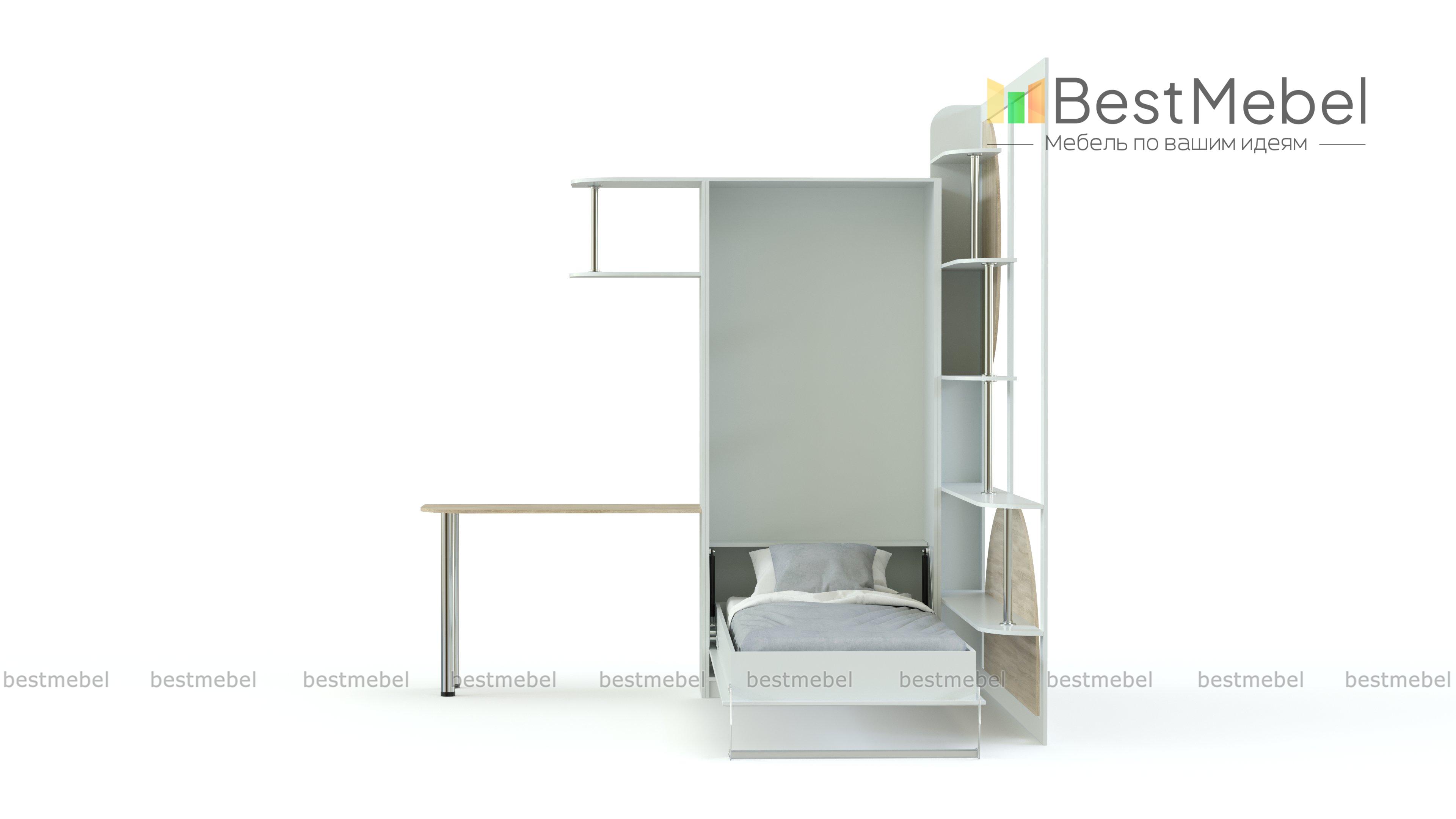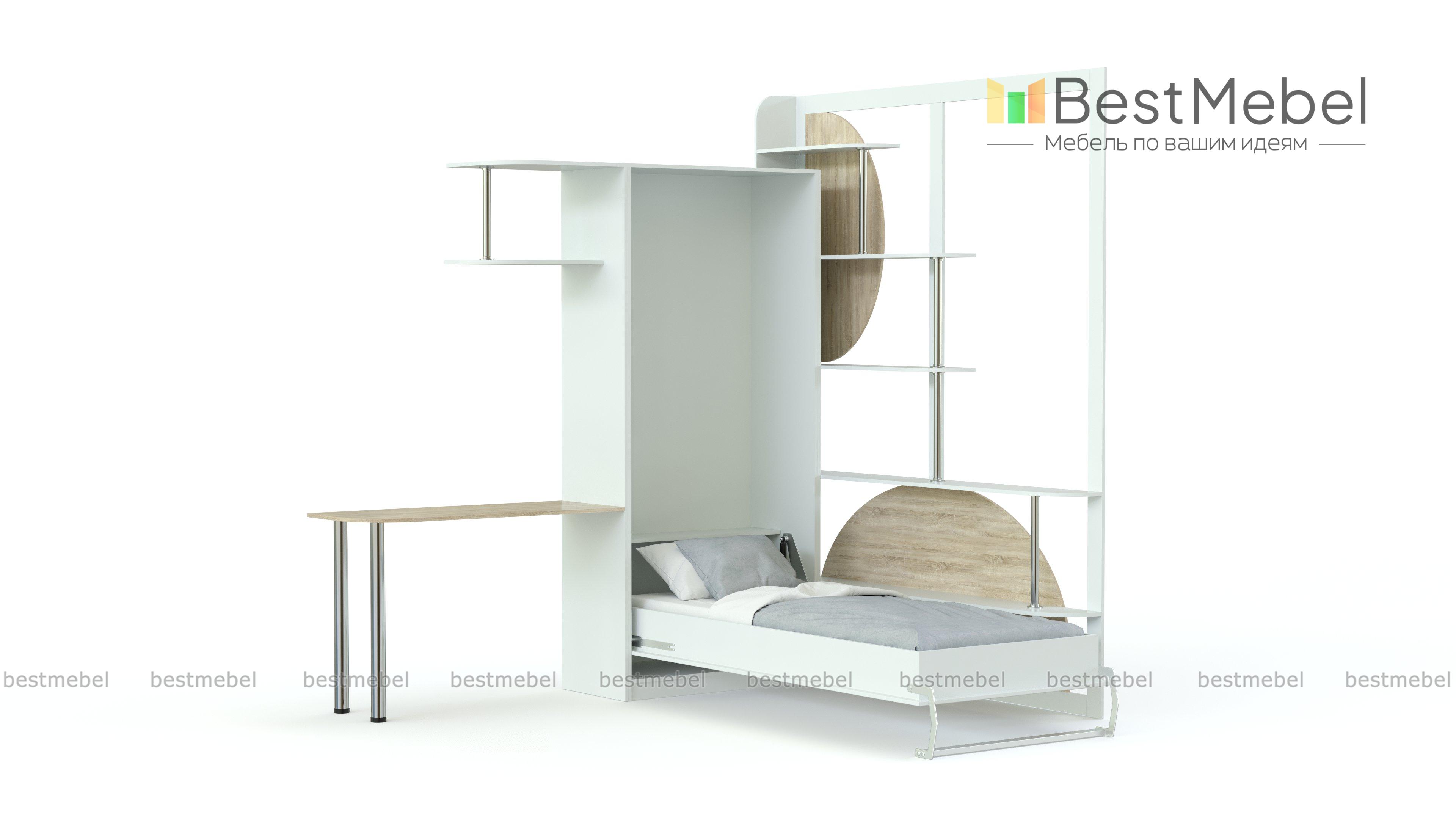 Шкаф-кровать трансформер Оранжерея BMS сочетает практичность конструкции и яркий современный дизайн. Прекрасный выбор для малогабаритной детской комнаты, модель позволит создать комфортный для учебы и отдыха интерьер, экономно используя пространство. Визуально легкая композиция включает в себя замаскированную под шкаф откидную кровать, открытые полки на хромированных опорах и письменный стол с надстройкой. Купить шкаф-кровать трансформер Оранжерея BMS вы сможете в нашем интернет-магазине по отличной цене.