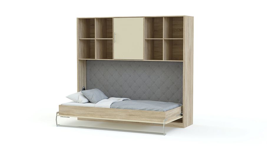 Шкаф-кровать трансформер Пион BMS в сложенном виде представляет собой лаконичный шкаф в скандинавском стиле и легко впишется в современный интерьер. Модель 2 в 1, оборудованная откидной кроватью-трансформером и антресолью с открытыми книжными полками и глухим распашным отделением, позволит сэкономить полезную площадь небольших квартир и студий. При помощи горизонтального механизма спальное место легко опускается вниз. Купить шкаф-кровать трансформер Пион BMS вы сможете в нашем интернет-магазине по доступной цене.