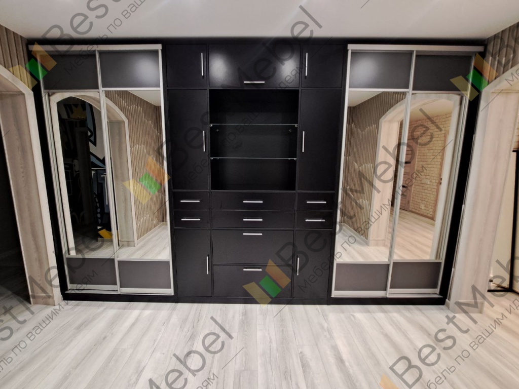 Этот вариант делали под нас, только у нас по одной зеркальной дверки с каждой стороны.Очень вместительно получилось!