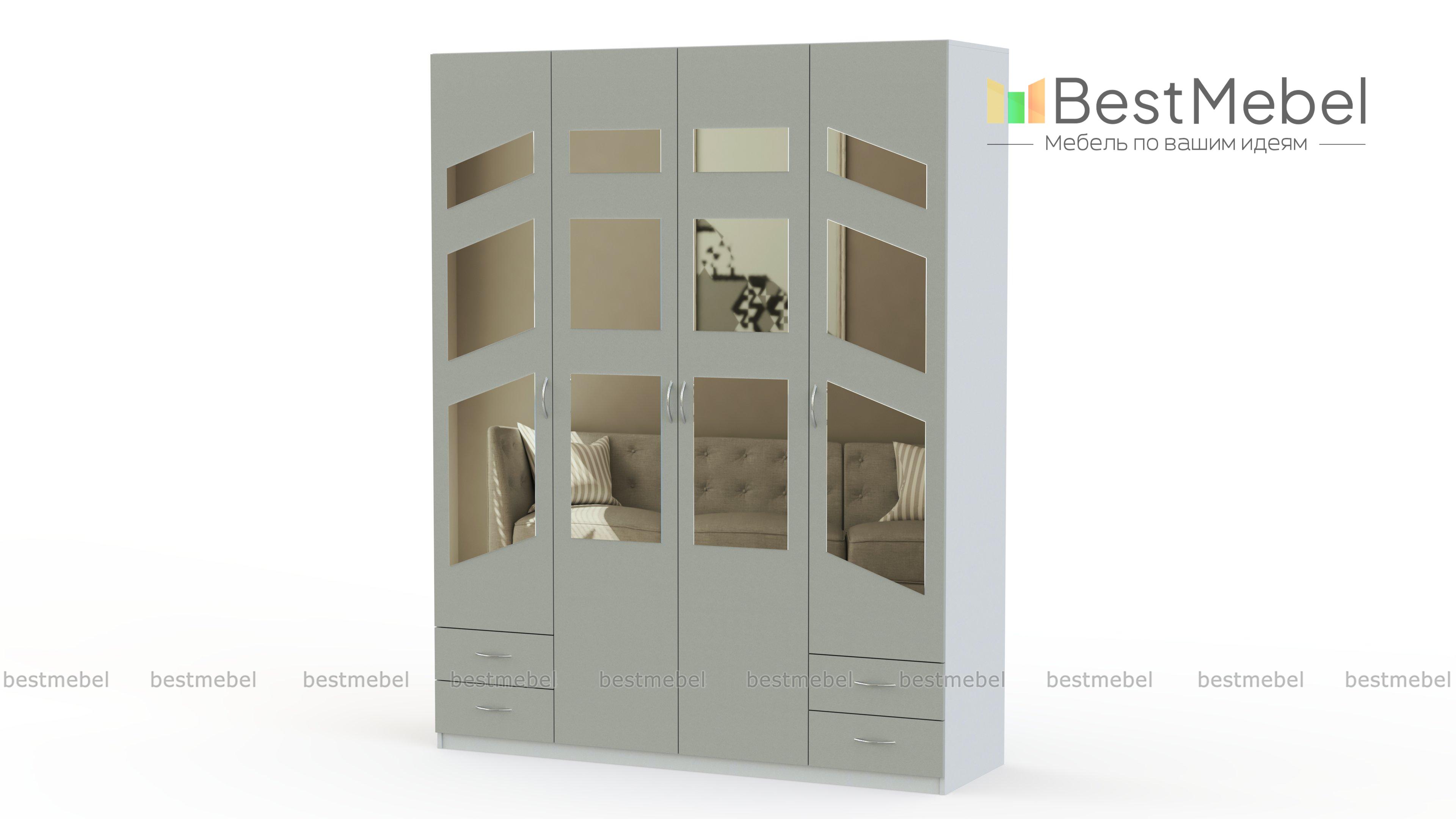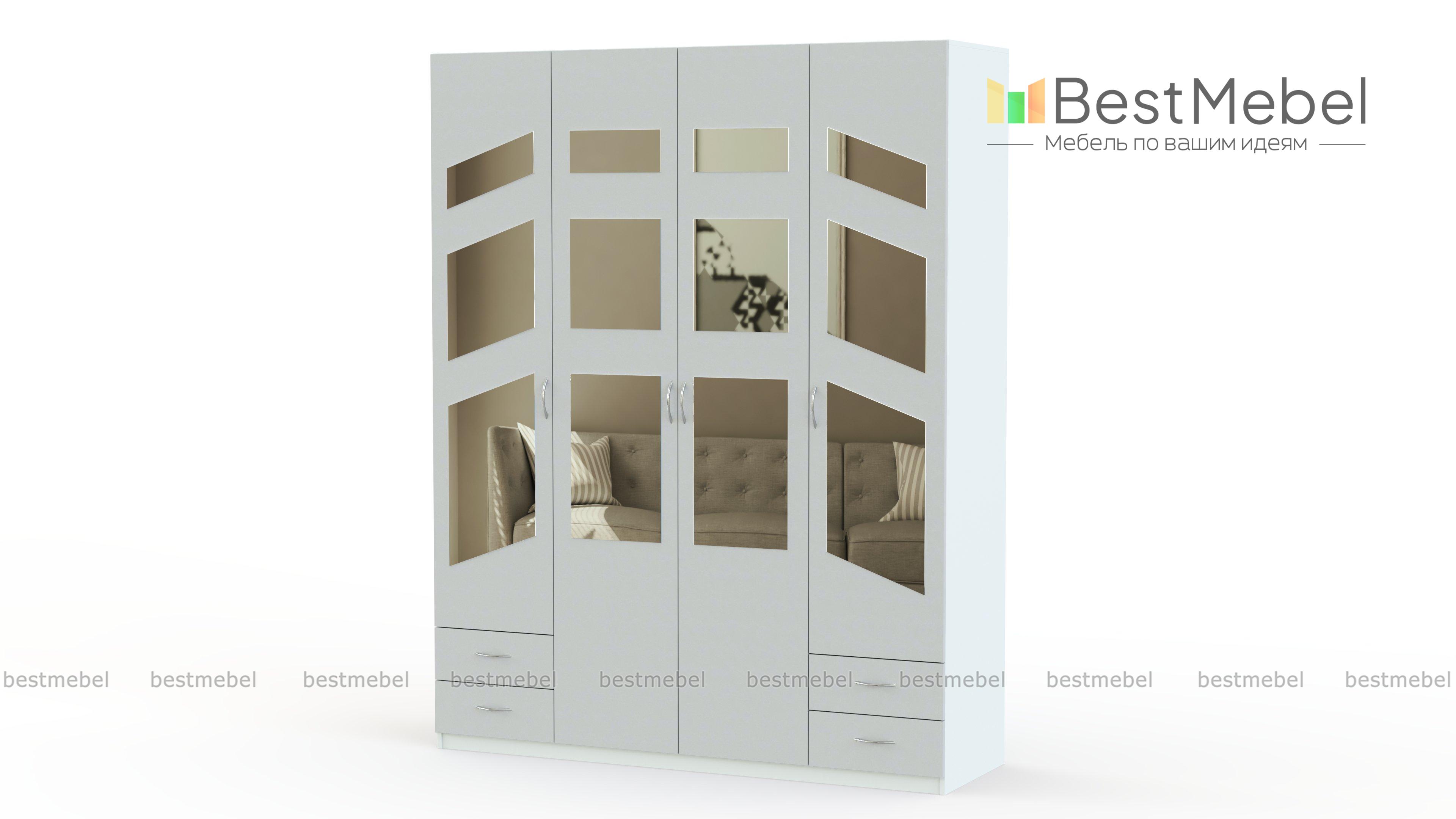 Распашной шкаф Паулина 53.1 BMS дополнит интерьер современной квартиры удобной и эстетичной системой хранения. Четырехдверная модель, выполненная в светлых тонах, отличается эффектным дизайном фасада, декорированного фигурными зеркалами. Компактно разместить предметы гардероба и постельные принадлежности помогут отделения с полками и штангой, а также четыре выдвижных ящика для мелочей. Купить распашной шкаф Паулина 53.1 BMS вы сможете в нашем интернет-магазине по доступной цене.