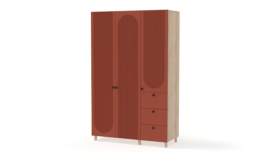 Шкаф распашной Рене 24 BMS удобен тем, что позволяет хранить не только вещи на вешалках, но и мелкий трикотаж, аксессуары, постельное белье. Двухдверное платяное отделение дополнили комбинированным пеналом с тремя выдвижными ящиками снизу. Цветной фасад шкафа украшает стильный геометричный рельеф, для легкости конструкции — высокие деревянные ножки. Купить шкаф распашной Рене 24 BMS вы сможете в нашем интернет-магазине, подобрав размеры и наиболее походящую цветовую гамму.