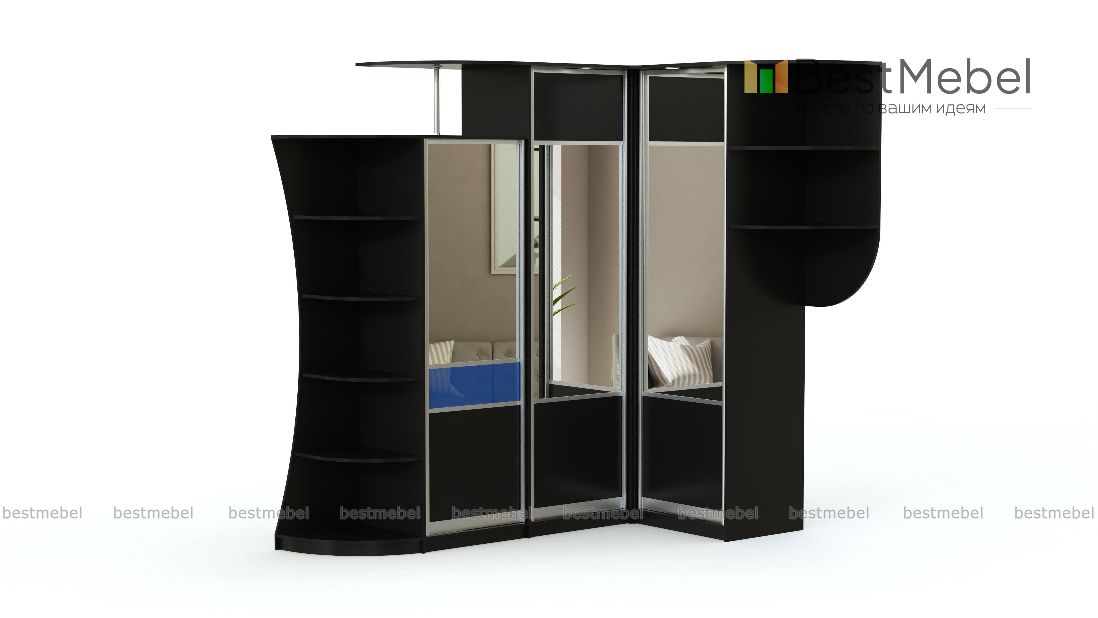 Шкаф угловой Гектор BMS - многофункциональная модель для прихожих, спален и детских комнат. Оригинальная разновысотная конструкция не выглядит громоздко, а форма позволяет максимально задействовать пространство. Распашные секции с зеркалами и цветной вставкой имеют встроенную подсветку, а дополняют основные отделения эффектно вырезанные торцевые стеллажи и надстройка. Купить шкаф угловой Гектор BMS и разместить предметы гардероба, книги, игрушки и многое другое вам поможет наш интернет-магазин.