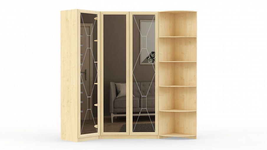 Шкаф угловой Наполеон 14.1 BMS станет не только практичным дополнением меблировки спальни, но и декоративным элементом. Практичная угловая композиция выполнена в древесных тонах и включает в себя пенал, двухдверный распашной шкаф и торцевой стеллаж с открытыми скругленными полками. Зеркальные фасады, визуально расширяющие пространство и незаменимые для примерок одежды, декорированы изящным пескоструйным рисунком. Купить шкаф угловой Наполеон 14.1 BMS для эстетичного и функционального интерьера приглашаем в наш интернет-магазин.