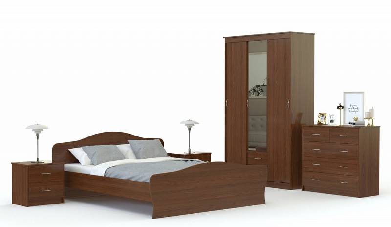 Заказывали для женской спальни в цвете бодега, такая воздушная. По просьбе нашей кровать сделали 120,, дно на ней - целый лист, выдержит и слоника, кажется, матрас отлично вписался стандартный. Комод удобен 4мя ящиками, тумбочки без открытых полок тоже функциональны. В шкафу надо было оставить стандарт - слева штанга, справа полки. Спасают выдвижные ящики.Всем довольны (пол года пробега).