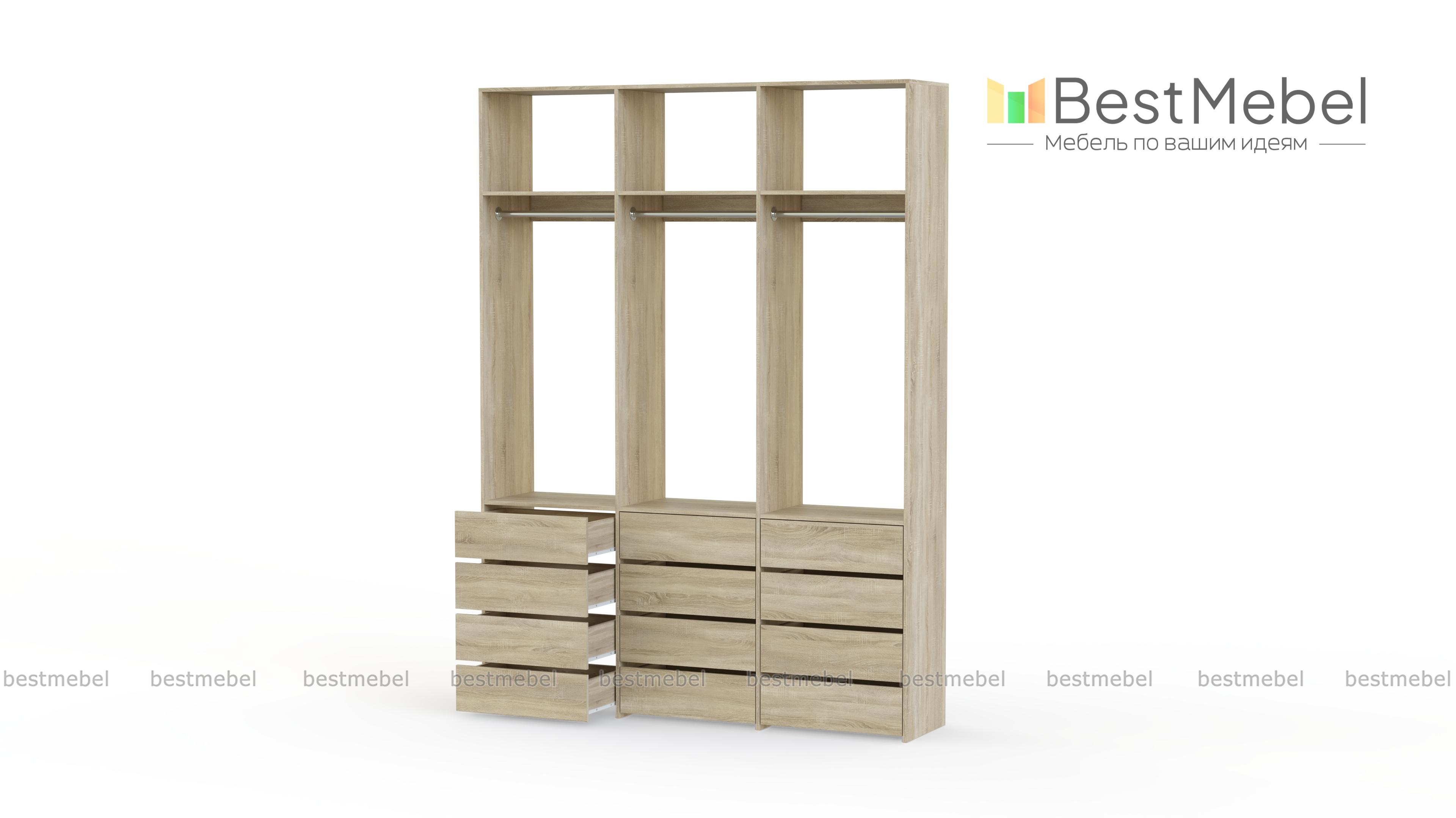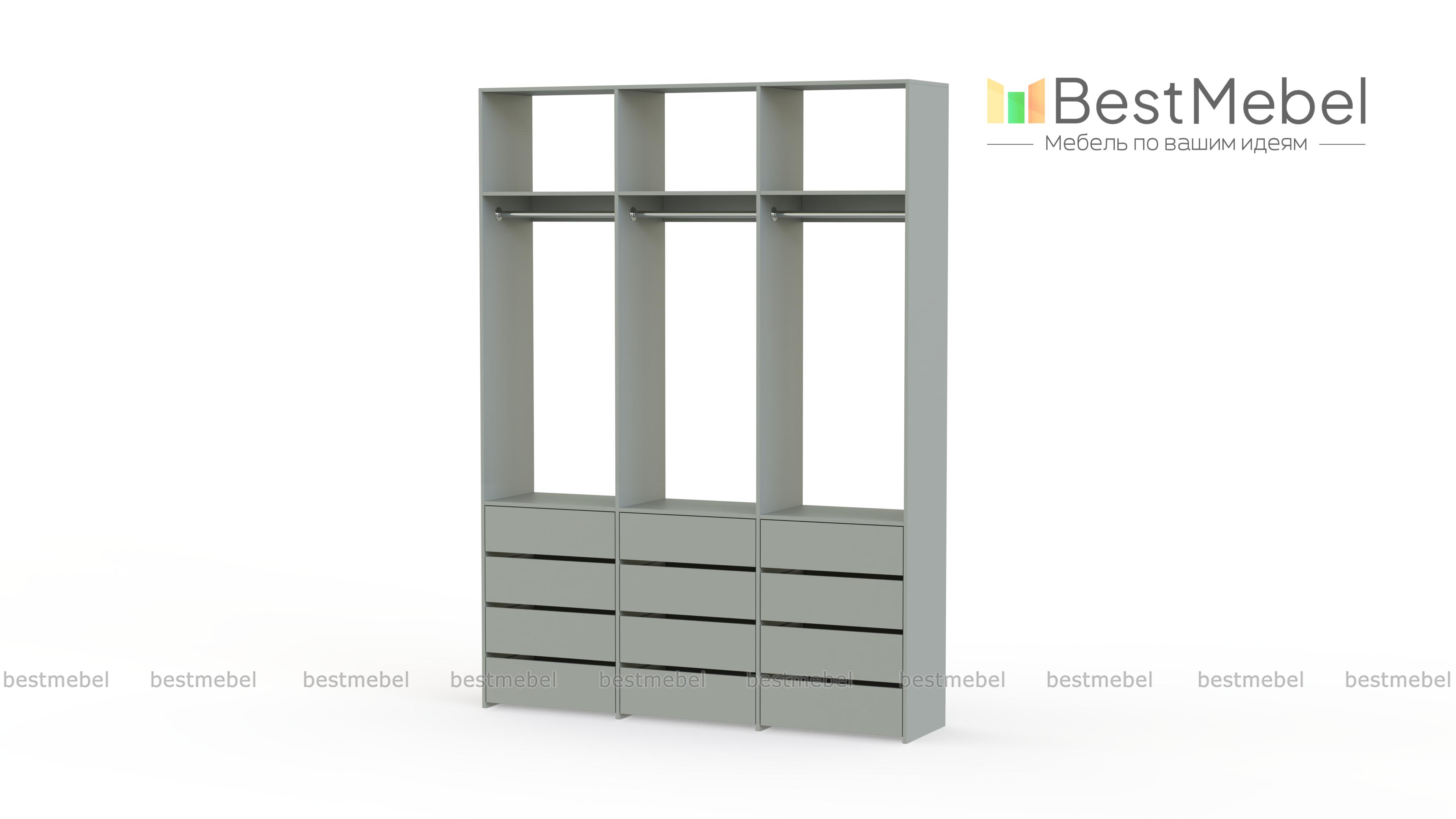 Стеллаж для одежды Мирта 47 BMS выполнен из прочной ламинированной ДСП и включает в себя три секции. В нижней части располагаются выдвижные ящики для текстиля и аксессуаров, средняя занята платяными штангами, а верхняя — полками для несезонных вещей. Минималистичный дизайн позволяет стеллажу легко вписаться в существующий интерьер. Купить стеллаж для одежды Мирта 47 BMS, изготовленный по индивидуальным размерам, вы сможете в нашем интернет-магазине.
