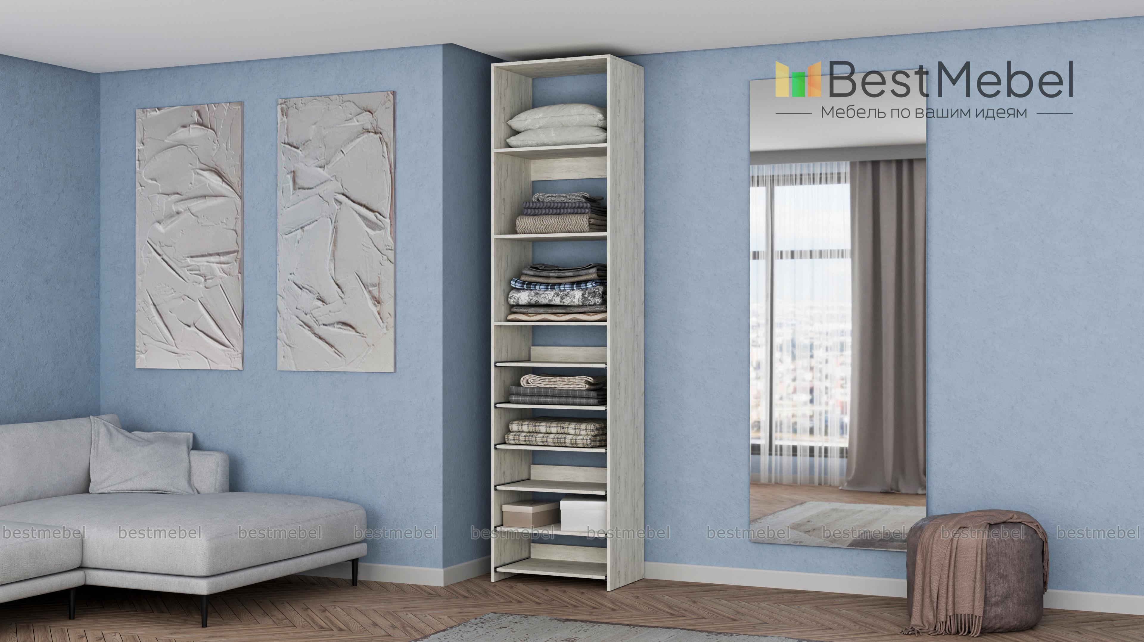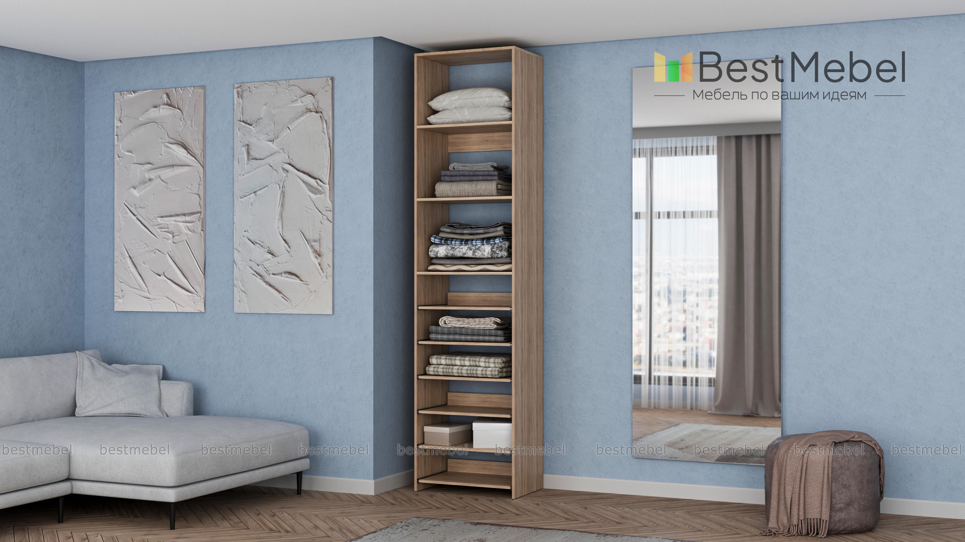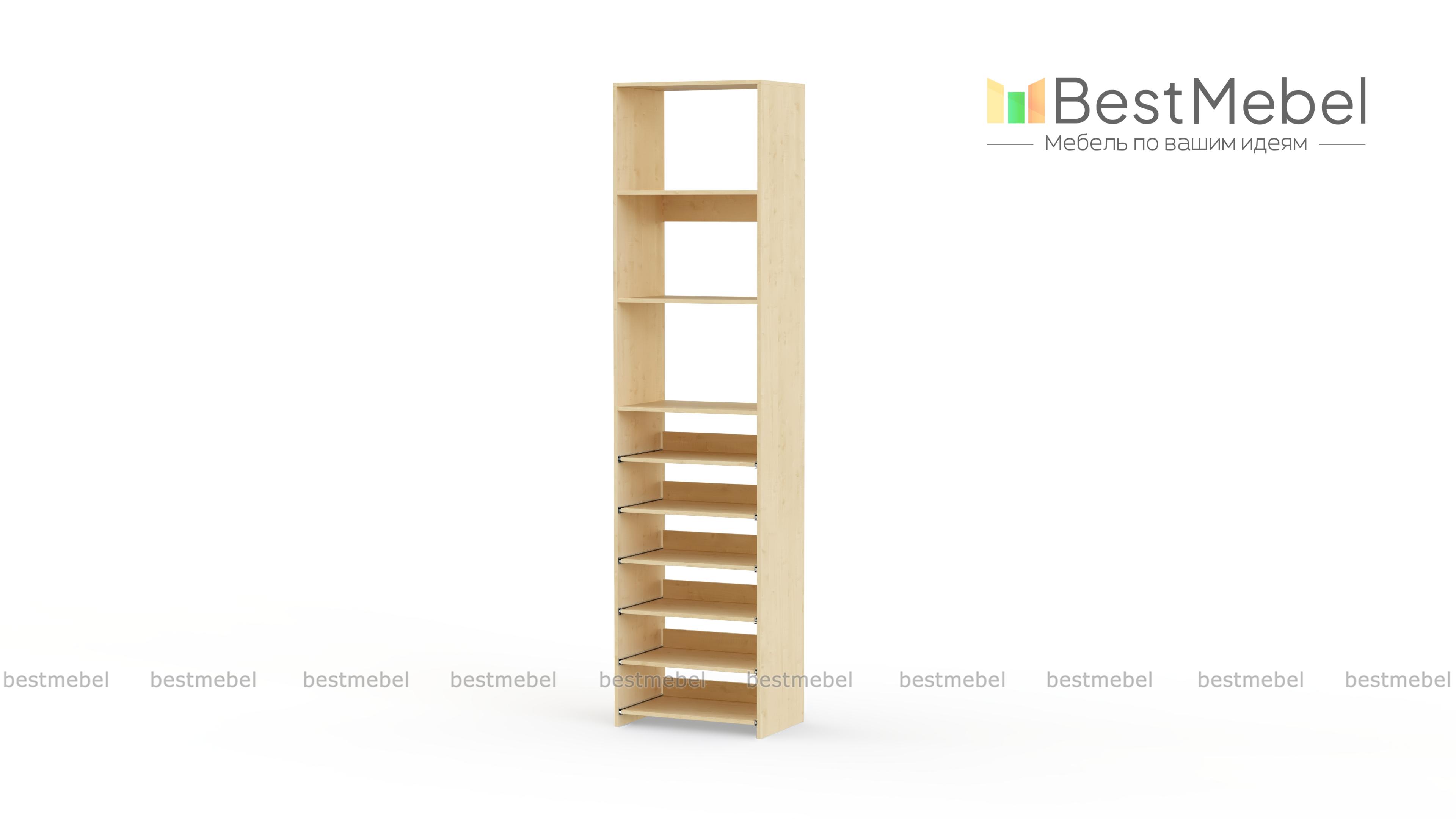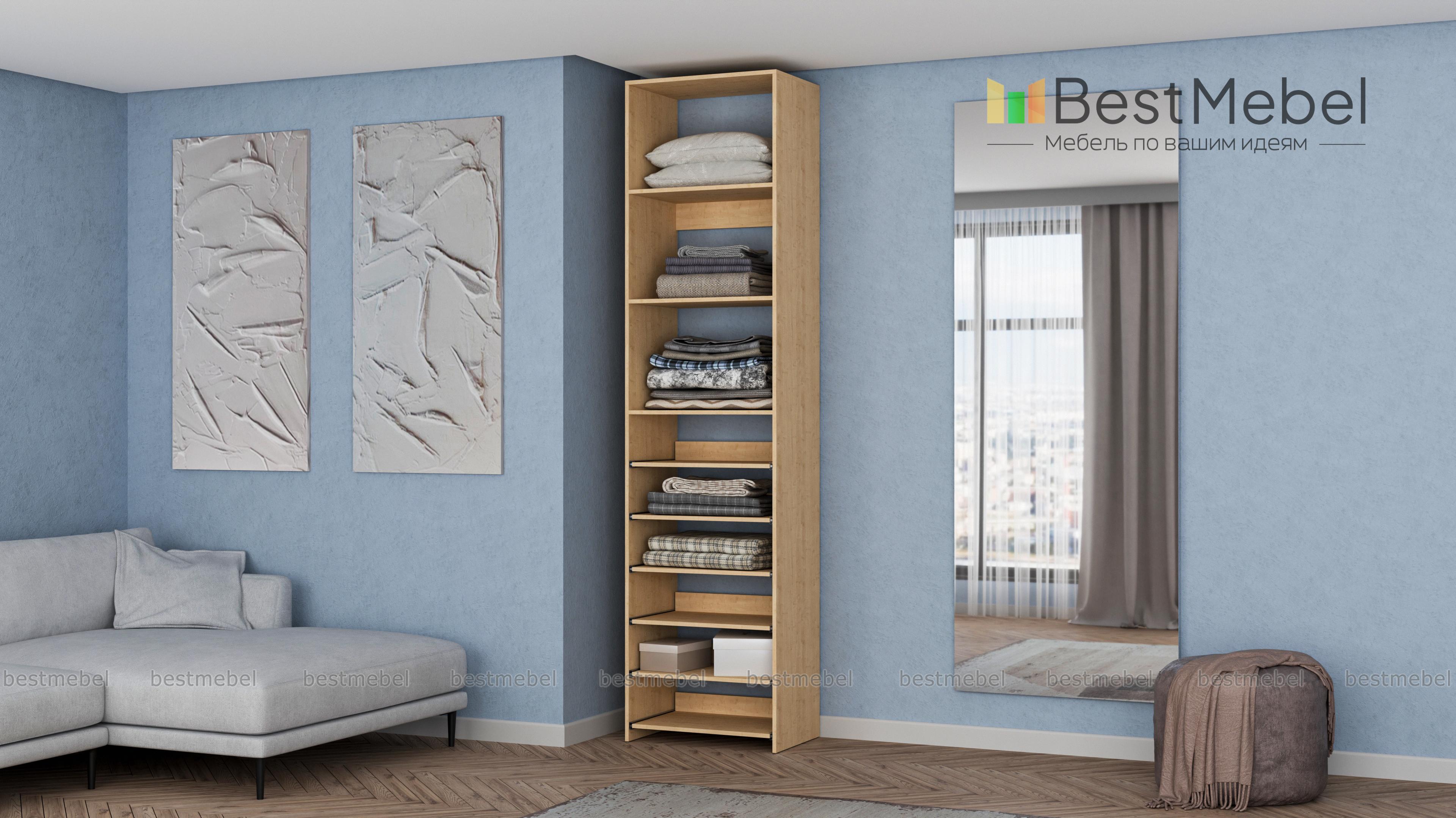 Стеллаж для одежды Мирта 76 BMS поможет с хранением, когда метраж ограничен. В комплектацию узкого стеллажа входят как стационарные, так и выдвижные полки, позволяющие разместить сложенную одежду, сезонную обувь и аксессуары. Для лаконичного современного дизайна прекрасно подходит ламинированная плита теплого древесного оттенка. Купить стеллаж для одежды Мирта 76 BMS с возможностью выбора цвета и габаритов приглашаем недорого в наш интернет-магазин.
