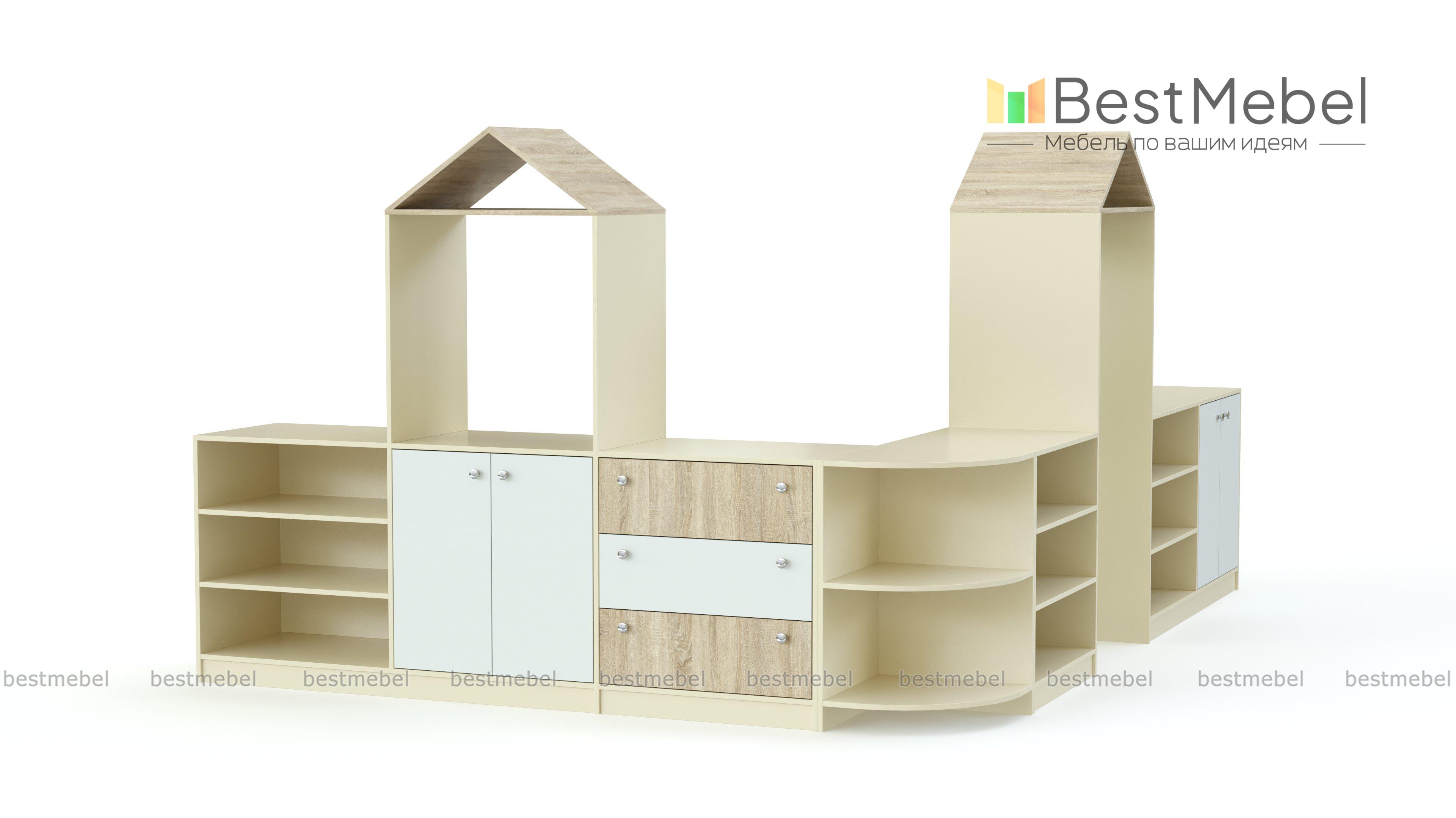 Стеллаж Эльф 4 BMS предназначен для меблировки детских садов и центров досуга, помогая зонировать игровую комнату. Угловая модель, стилизованная под домик, оборудована открытыми полками, глухими распашными отделениями и выдвижными ящиками для удобного хранения игрушек, книг, разнообразных учебных пособий и демонстрационных материалов. Ламинированные поверхности просты в уходе и сохранят эстетичный вид на протяжении всего срока службы. Купить стеллаж Эльф 4 BMS вы сможете в нашем интернет-магазине, подобрав цветовое решение.