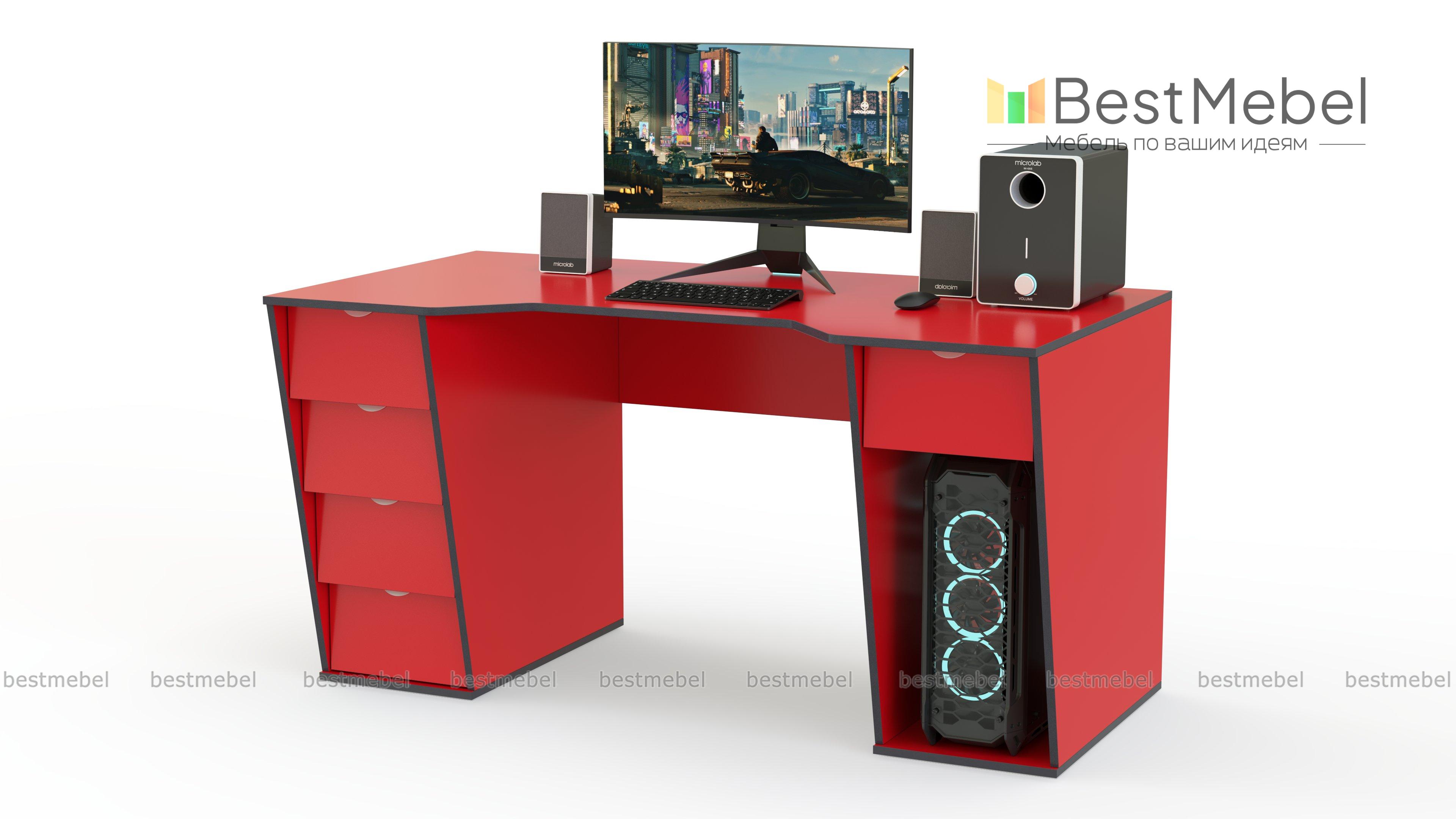 Геймерский стол Шторм 8 BMS с двумя массивными опорными тумбами выполнен в белом цвете с контрастной черной кромкой. Креативная модель со скошенными фасадами оборудована нишей под системный блок и выдвижными ящиками с торцевыми ручками для удобного хранения рабочих материалов. Просторная столешница с трапециевидным вырезом позволит разместить монитор, игровую клавиатуру и прочие периферийные устройства. Купить геймерский стол Шторм 8 BMS приглашаем в наш интернет-магазин с выбором фурнитуры и цвета по каталогу.