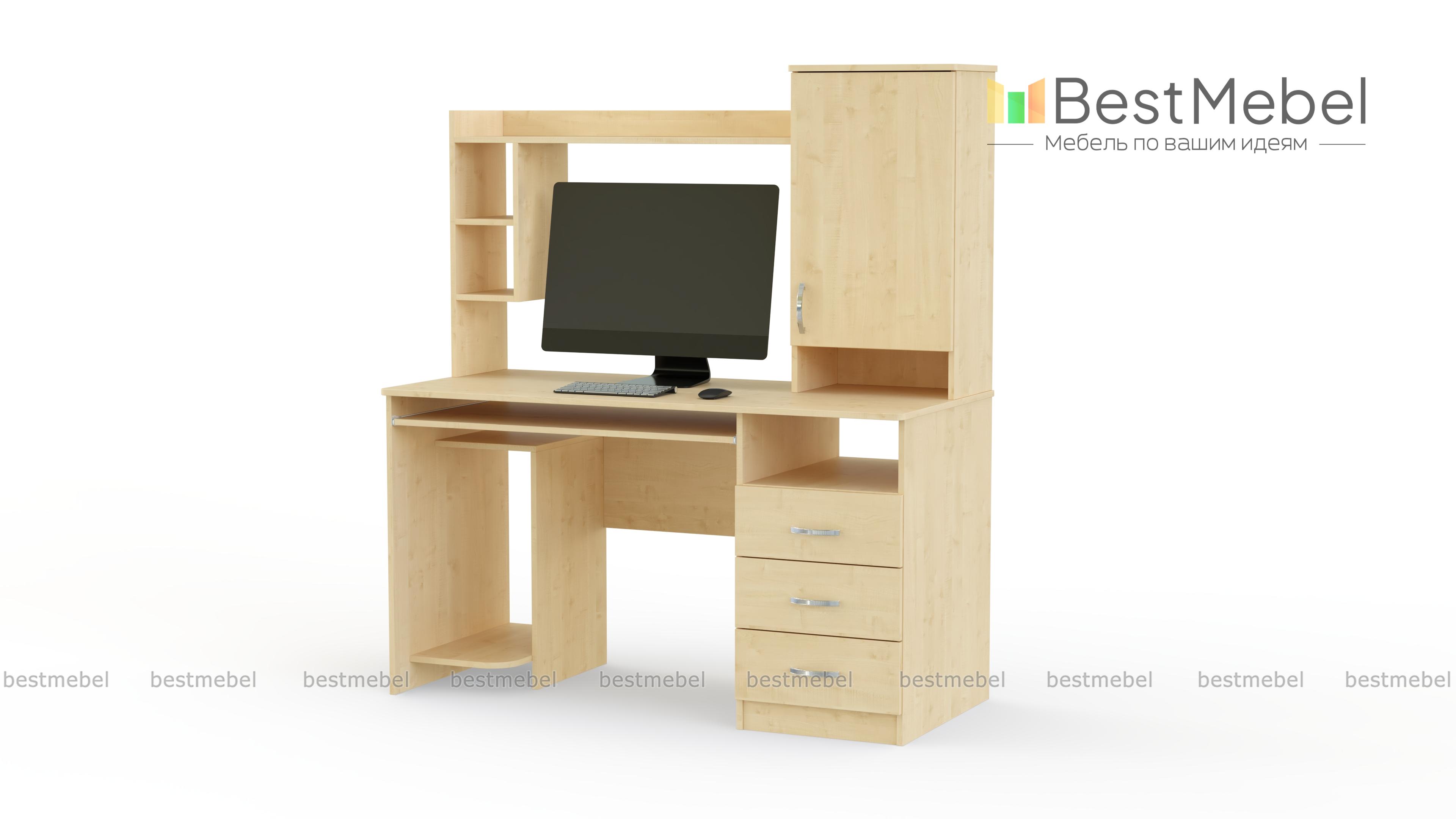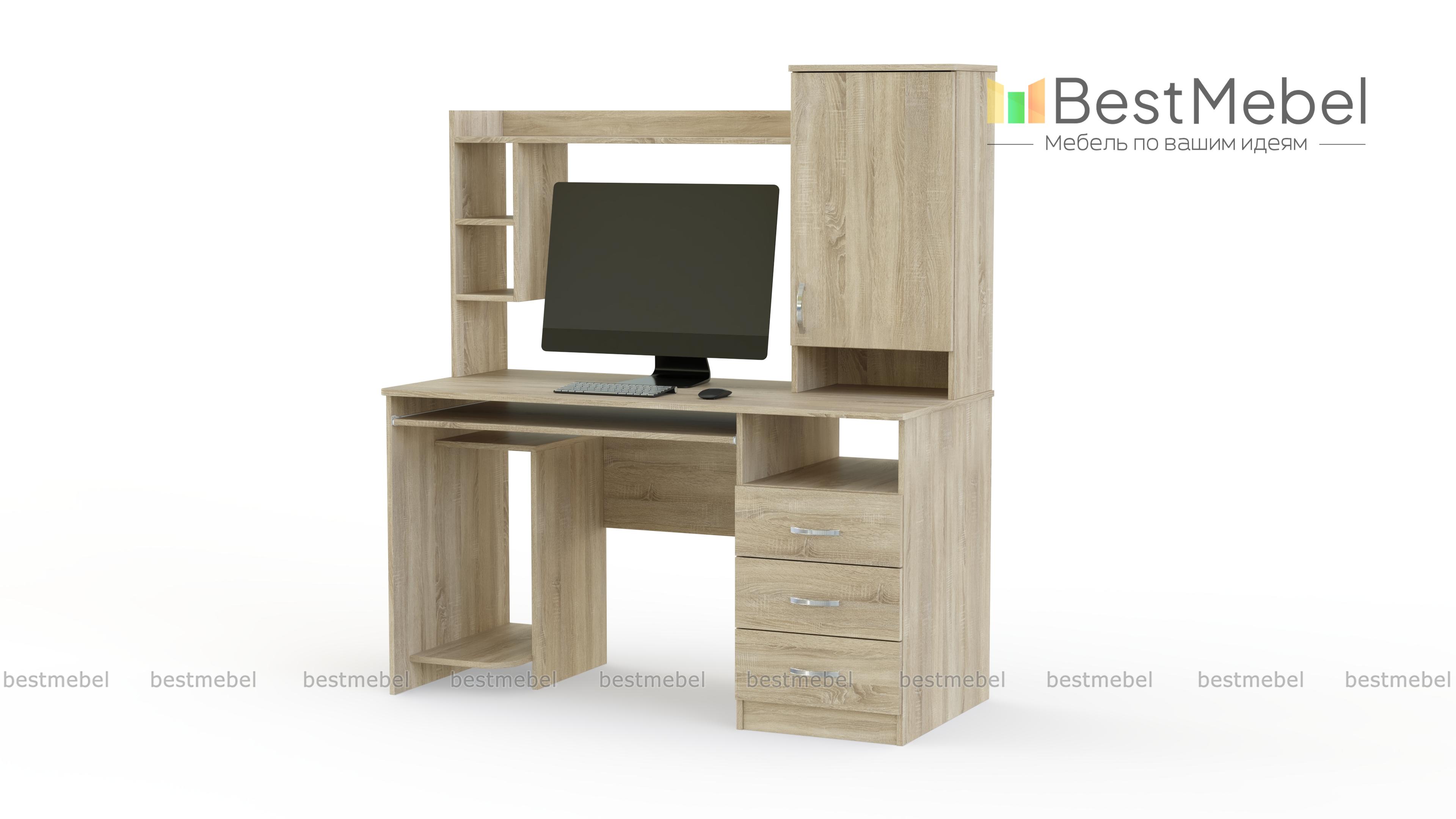 Очень удобная модель, особенно если нужен многофункциональный и современный стол. При небольших габаритах, в нем имеется не только все необходимое для удобного размещения компьютерной техники, но и достаточно места для хранения множества необходимых бумаг и предметов. Стол компьютерный ПСК-4, кроме полочек для мелочей, принтера, сканера, монитора и колонок имеет две большие тумбы: нижнюю с выдвижными ящичками и верхнюю с полками. Купить такую модель можно для дома, небольшой приемной или офиса.