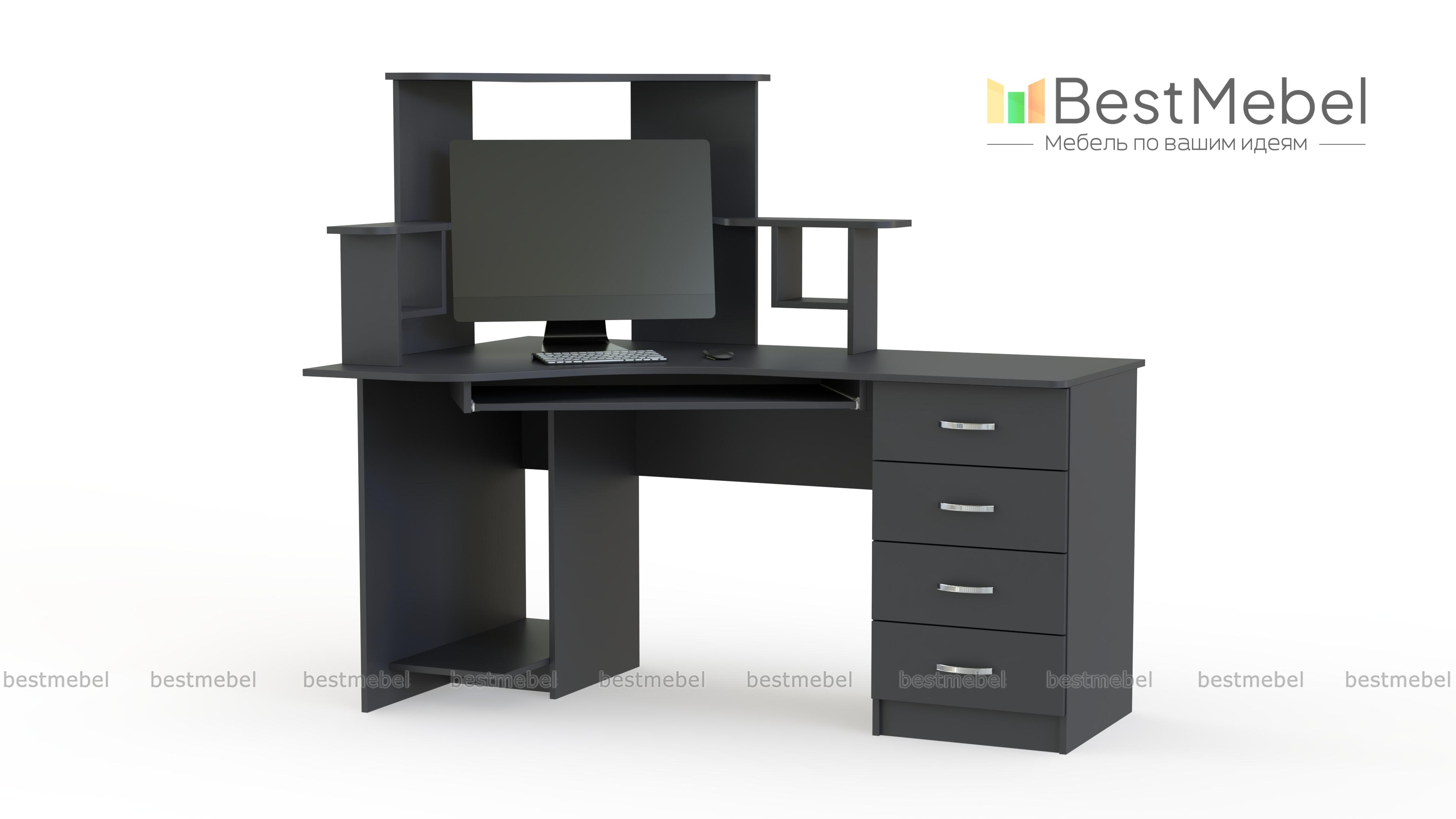 Угловой стол компьютерный СКУ-5 станет отличным решением для комнаты небольших габаритов. Большое количество полок позволяет разложить необходимые Вам диски, а также журналы, книги или канцелярские мелочи. Наличие нескольких выдвижных ящиков позволяет хранить Ваши необходимые документы. На широкую столешницу можно установить монитор с любой диагональю, а системный блок помещается на специальную полку снизу. Купить такой стол Вы можете недорого в нашем интернет-магазине.