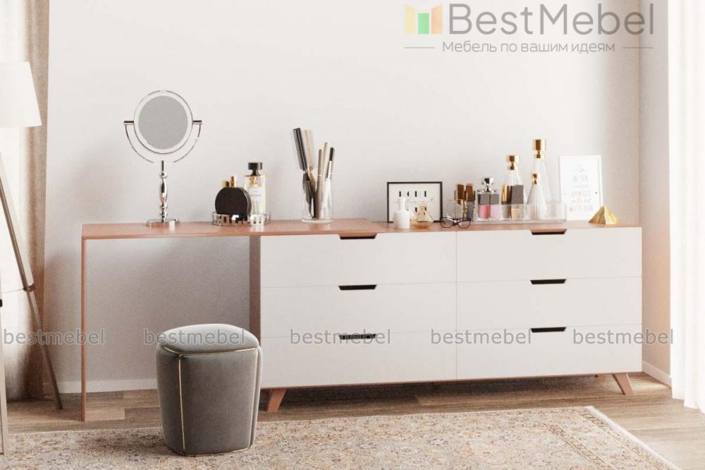 Туалетный столик Адам BMS – это многофункциональная модель, которую вы сможете использовать не только для хранения постельного белья, аксессуаров и разнообразных мелочей, но и для ухода за собой или работы за ноутбуком. Лаконичный комод в скандинавском стиле оборудован шестью выдвижными ящиками с ручками-вырезами, высокими скошенными ножками и совмещен со столом. Купить туалетный столик Адам BMS, выполненный в сочетании древесных тонов и белого, приглашаем в наш интернет-магазин.